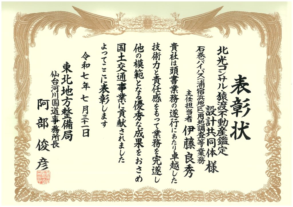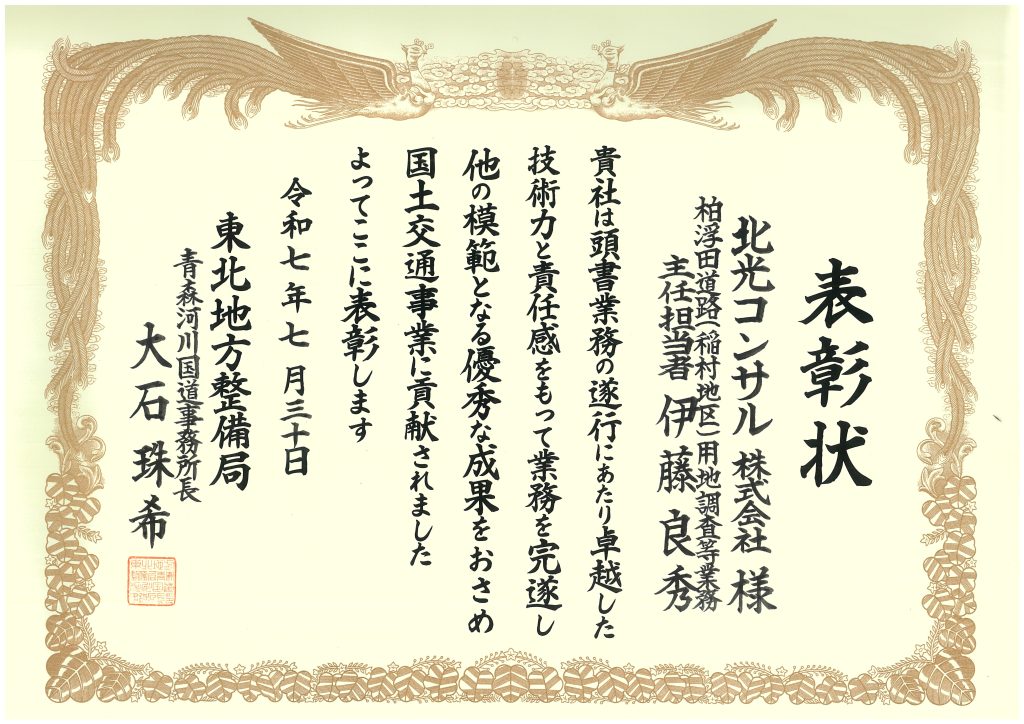 弊社では、令和7年度も国土交通省東北地方整備局管内の2つの事務所より、令和6年度に実施した業務において表彰を受けました。